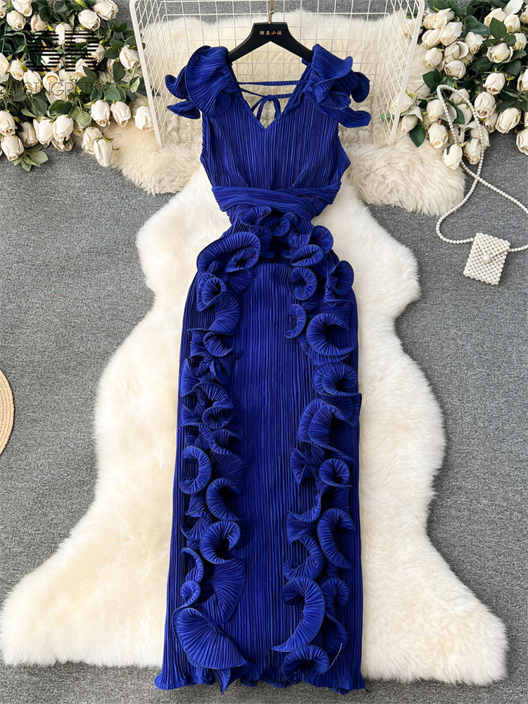 Vestido Longo Sem Manga Babado Decote Redondo Valentina